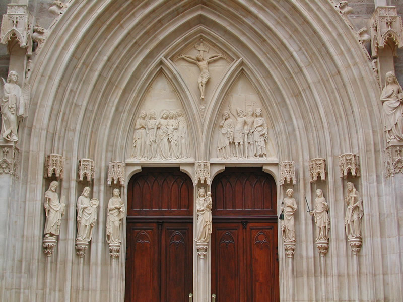 Spitzbogenportal mit Skulpturen und Reliefs, aus Auer Muschelkalkstein, 1339