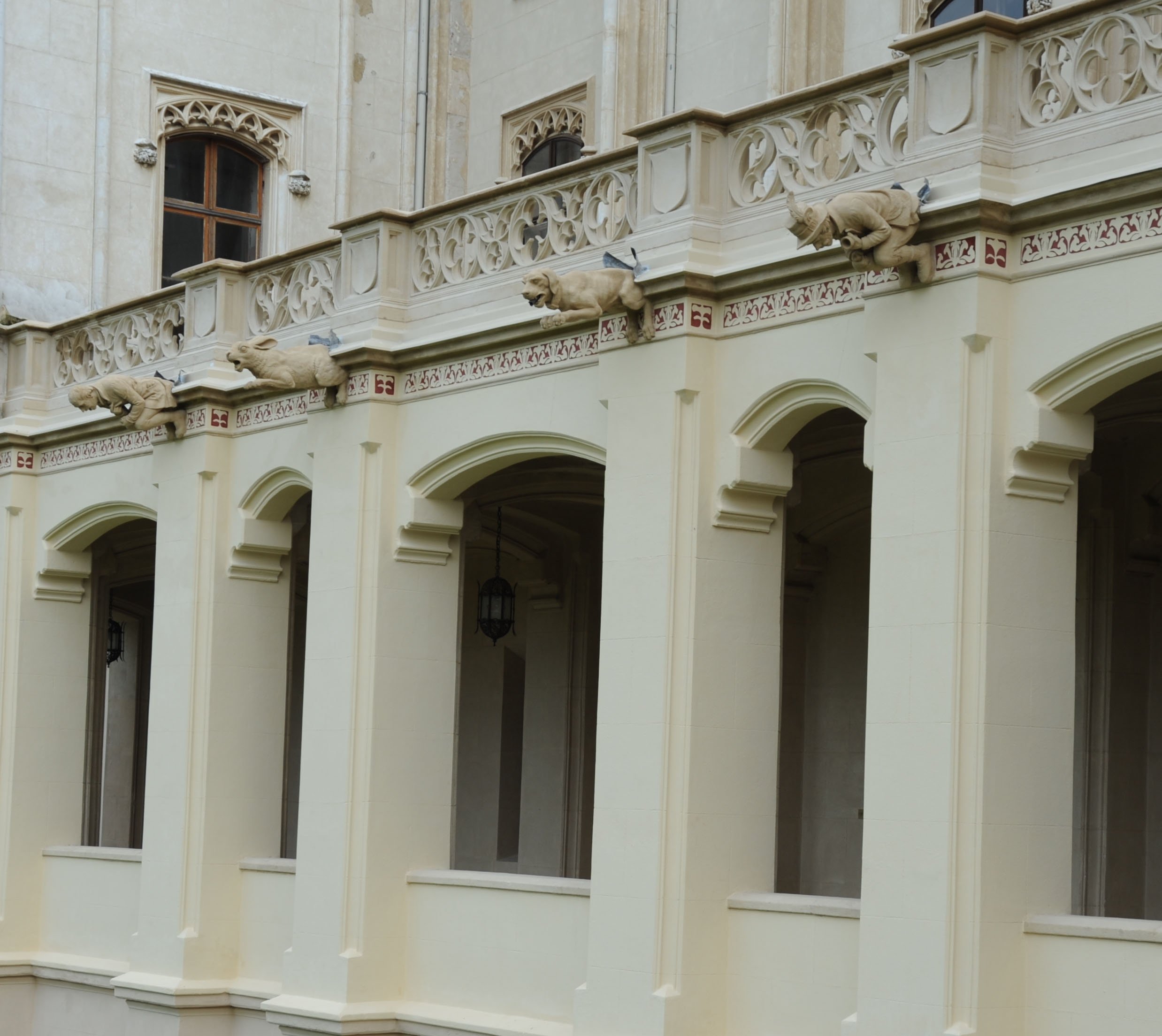 Nordfassade, Altane mit Wasserspeiern und Arkaden, 1845 - 1872Wasserspeierfiguren aus St. Margarethner Kalksandstein, Konservierung und Ergänzung in Situ, Stabilisierung und Rekonstruktion des Ornamentbandes in Kalk-Secco Technik, Putzsanierung und Anstrich in Kalktechnik