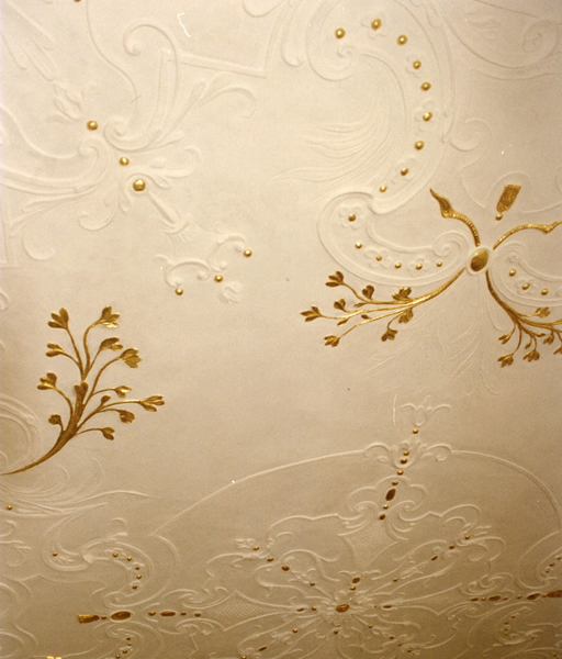 Decke, Barockstuck vergoldet, Wasserschaden, um 1750Abnahme des geschädigten Bereiches, Stabilisierung, Wiedermontage, Rekonstruktion, Vergoldung