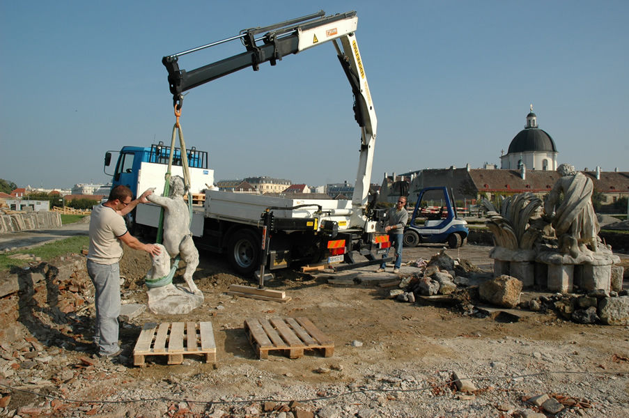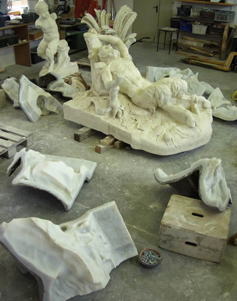 Baroque fountain, sculptures of shell limestone from Zogelsdorfer (larger than life size)Dismounting, reconstruction, production of a copy from artificial limestone, assembly
