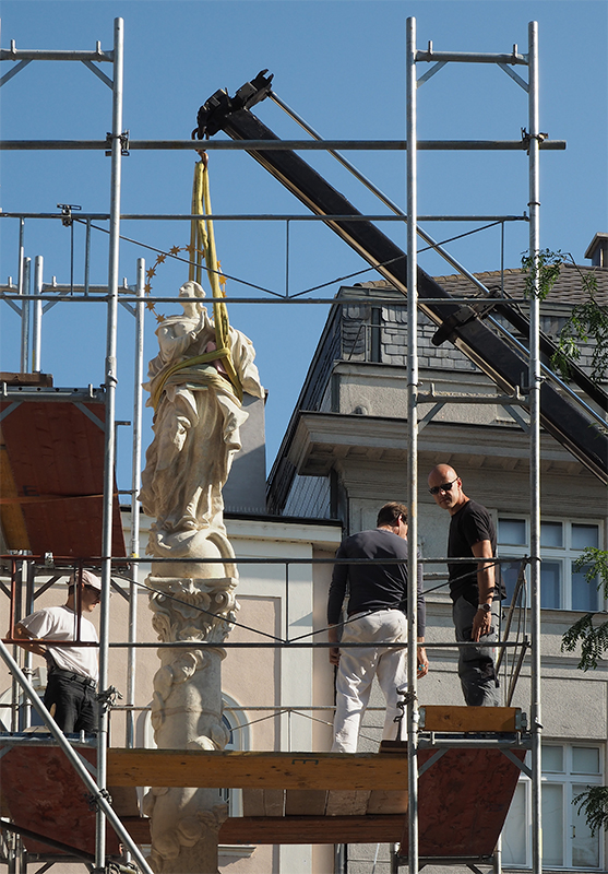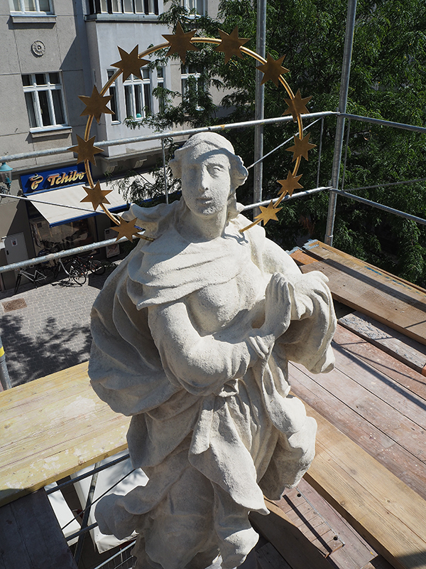 Marian column in limestone from Zogelsdorf, Baroque 1718Dismounting, preservation and appendix, re-gilding of metallic artefacts, cleansing, repairing and coating of laterns, assembling, lime-whiting