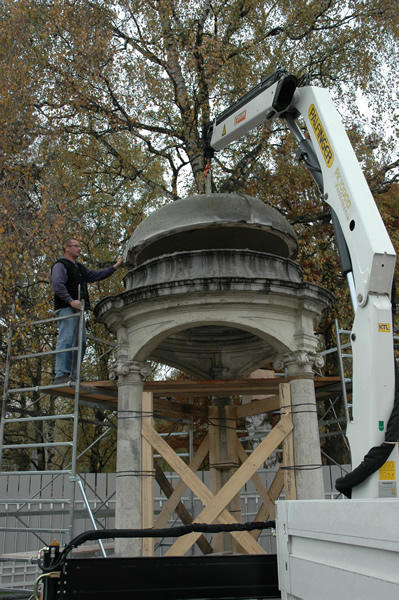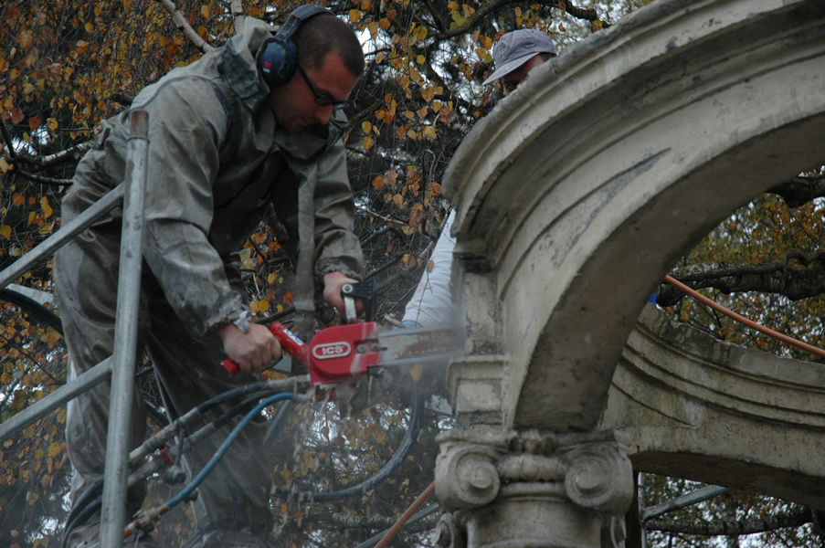 Limestone architecture and polychrome figure of St. John of Nepomuk, 18th centuryTotal removal, new foundations, restoration, polychromical work, rebuilding