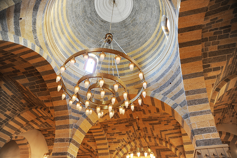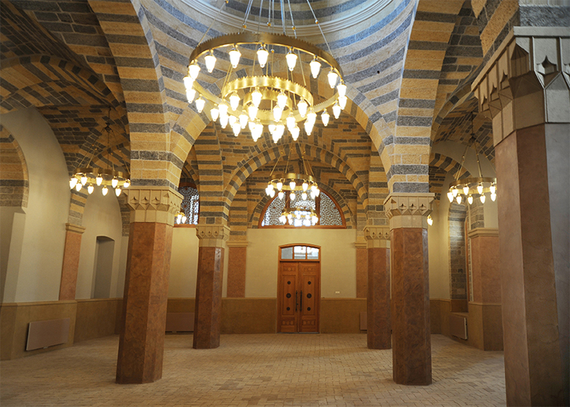 South facade with minarets, prayer room, mihrab prayer niche, 19th centuryTotal renovation, GU order: Roof renovation, facade restoration in Absheron limestone, complete interior renovation, interior, color design, sanitary room, electrical systems, heating, lighting technique