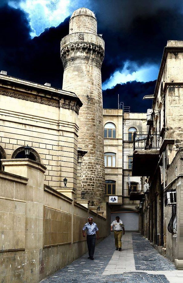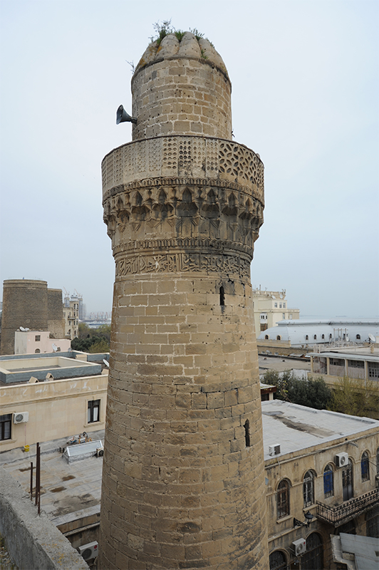Historic Old Town "Icherisheher",16th century, approximately 25 m height, balcony with differently ornamented parapet panels, decoration with stalactites, among them inscription in "Kufi" writing ornaments, Absheron limestonestatic securing of the foundations, total renovation of the outer facade including the oriental decoration, balcony renovation, soil sealing and drainage, renovation of the inner staircase, electrification, lighting and speaker technology
