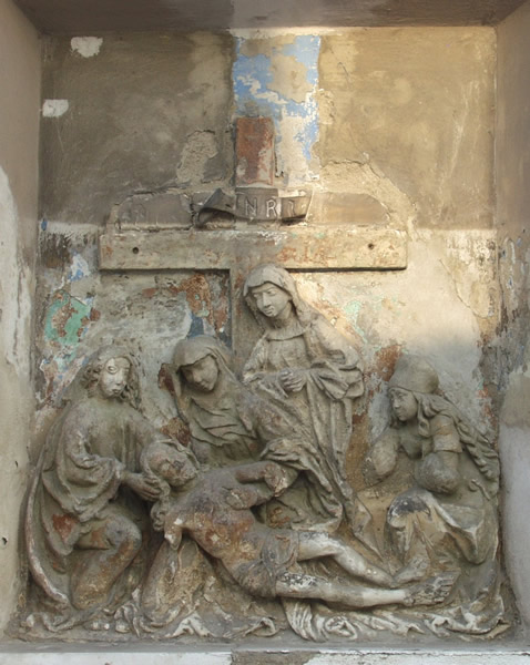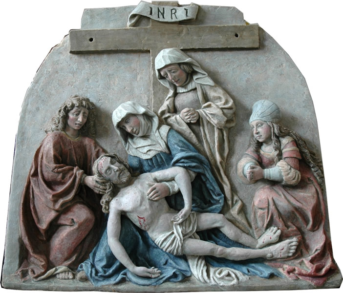 Late Gothic relief, limestone, polychrome (120 x 120 cm), ca. 1500Original polychrome exposed, structural completed, reconstruction of polychrome with watercolours